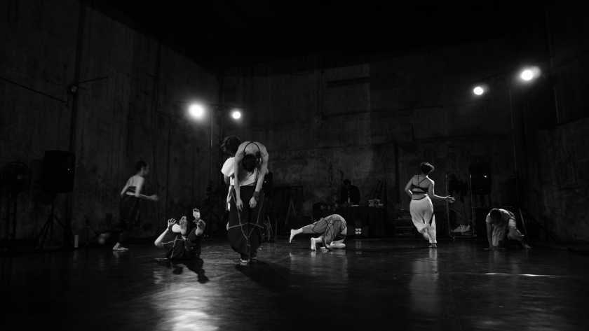 Sementara di sisi lain panggung, enam orang berbaring di lantai, menangggapi beat musik yang kian kencang. Terkulai, mengejang. Kerapuhan yang menolak untuk menyerah, untuk mati.